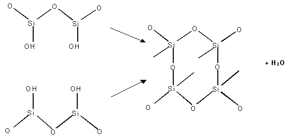 At high pH values silica and alumina are moderately soluble and strength giving reactions occur whereby silica and minerals containing silica and alumina first hydrolyse and then tend to bind together losing water as depicted in the diagram below.