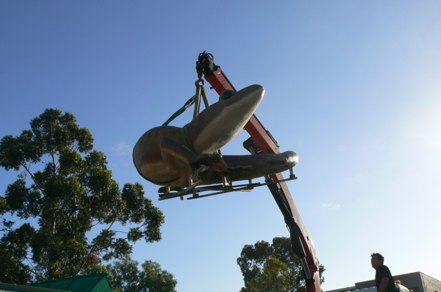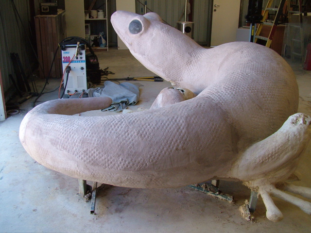 According to Alan "At last, (I) lifted the gecko out of the studio and installed it at its final resting place. Its final weight was about 700kg. It was acid stained and coated with an anti graffiti coating. It survived the lift and transport without cracking, so I must have done something right. Thanks for your help with the Tec Cement."